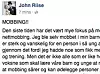 Vi er et lite land, da må det vel være viktigere at vi tar vare på hverandre enn å trykke hverandre ned med mobbing? La oss stå sammen mot mobbing. Det er IKKE kult å mobbe, det ødelegger andres liv. Vi må alle tørre å si ifra. Uansett om det er på gaten, skolen, jobb eller andre steder, mobbing er veldig veldig farlig!, skriver John Arne Riise på sin Facebook-konto og Twitter-konto natt til tordag.